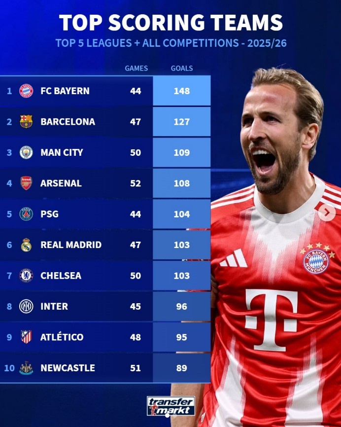 乐鱼体育官方下载-本赛季五大联赛球队总进球榜:拜仁148球断层领跑,巴萨次席